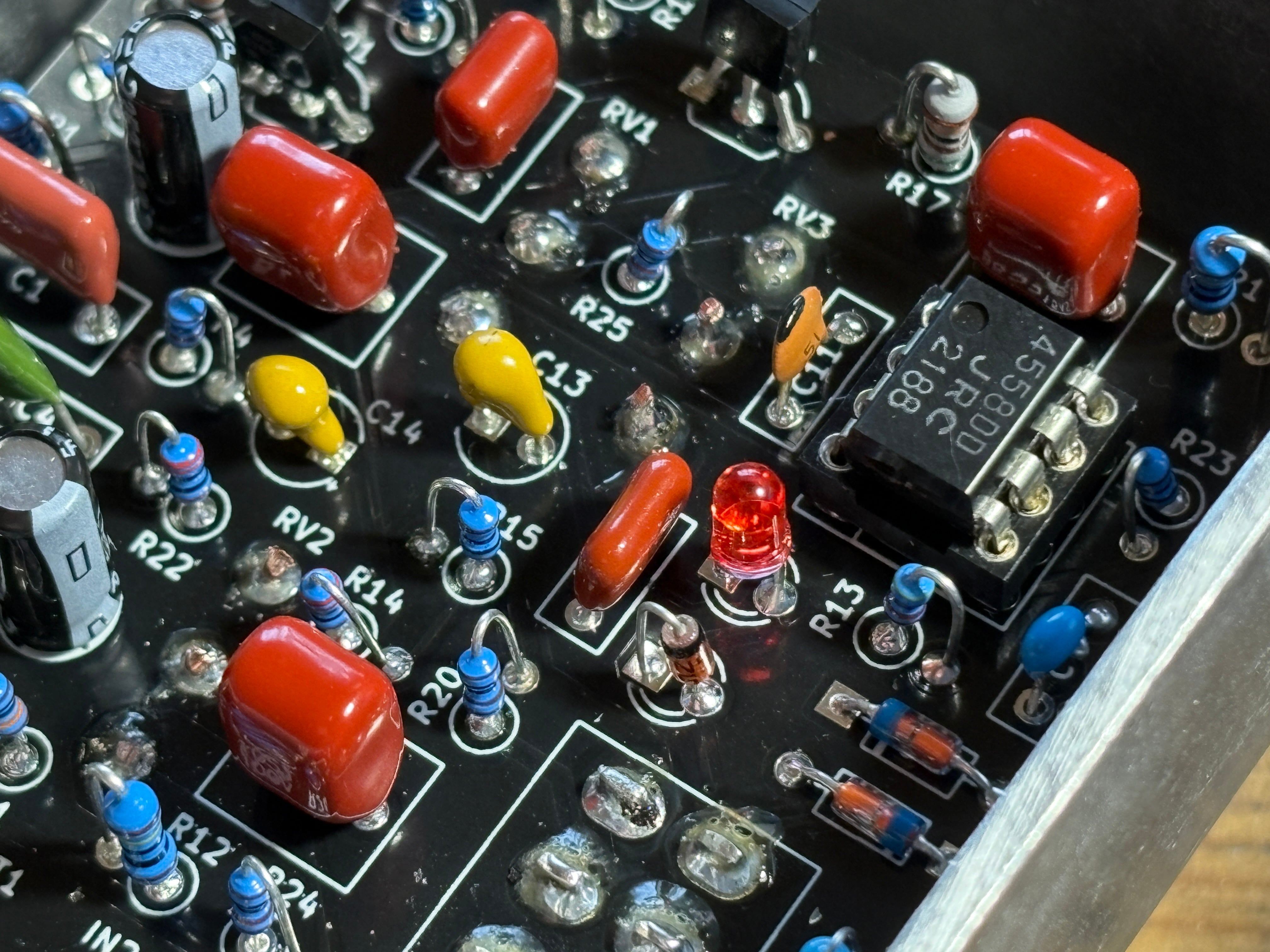 回路定数はオリジナルを踏襲していますが、信号ラインで使われていた無極性の電解コンデンサーをフィルムコンデンサーへ変更しました。